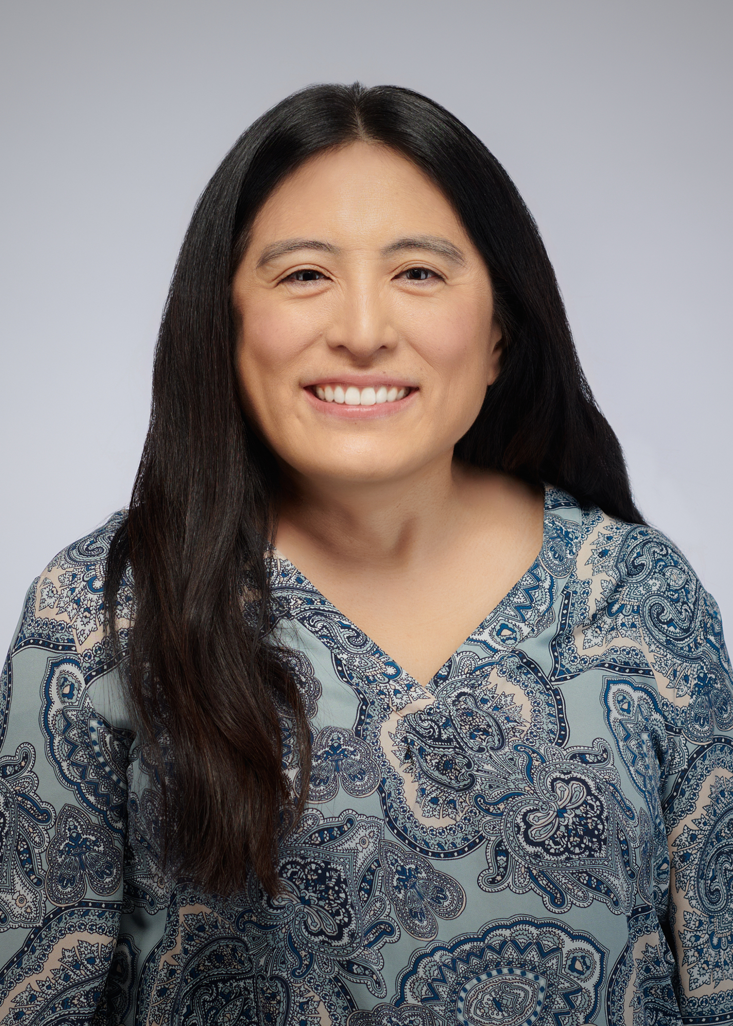 picture of woman with long dark hair, wearing a grey patterned shirt, set against a grey background, photo in shape of circle